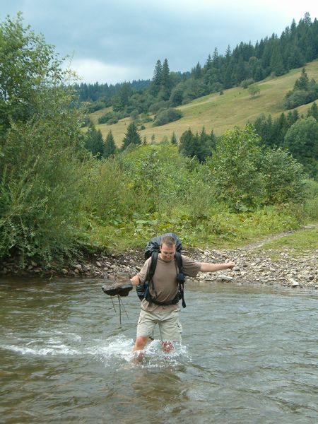 Po nočním dešti a ranní koupeli jsme vyrazili na místo. Oblast, kterou nám popsal pan Vodenka - Jíra, poslední žijící pamětník tábora u Sinovíru, zabírala několik kilometrů čtverečných a i s dobrou mapou a znalostí fotografií jsme si nálezem nebyli příliš jistí. Úkolem bylo tedy hlavně zmapovat blíže terén a připravit podklady pro další identifikaci místa v Praze (což se nakonec podařilo). Několik hodin jsme tedy strávili focením, srovnáváním s mapou, procházením luk a lesů, úvahami o poloze tábořiště a dokonce multilingvním rozhovorem s panem Mikolou, patrně nejstarším pamětníkem v chalupách u Ozerjanky, který se narodil sice až v roce 1939, ale z vyprávění věděl něco o »pioněrském lageru«. Po důkladném zdokumentování jsme se dosyta vyřádili v dravém proudu říčky, který nás unášel nádhernou krajinou a zamířili opět do Mižhirji a Chustu.