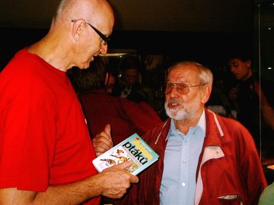 Setkání předsedů SPJF - vlevo současný předseda PhDr. Miloš Vraspír (v červeném tričku k výročí RŠ 2008), vpravo bývalý předseda SPJF Jiří Punčochář.