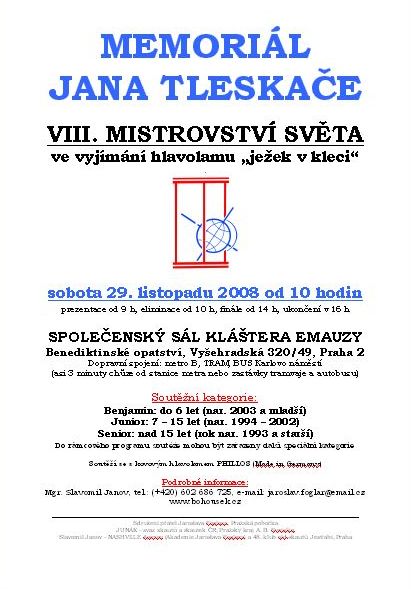 Memoriál Jana Tleskače - VIII. mistrovství světa ve vyjímání hlavolamu „ježek v kleci“[ Autor: Slavomil Janov - Nashville | zařazeno: 20. 11. 2008 | přečteno 20086 ] Ježek v kleci je bezesporu nejznámějším českým hlavolamem. Jeho princip vychází ze dva tisíce let starého čínského hlavolamu v podobě hada, který svírá mořskou hvězdici. Ze sevření plaza lze hvězdici vysvobodit krouživými pohyby. Podobným způsobem se vyjímá i ježek z klece. První hlavolamy v podobě ježka v kleci byly vyrobeny na přelomu 19. a 20. století a následně patentovány v USA a Japonsku. Ve dvacátých letech minulého století se hlavolam objevil i v Evropě. Zcela nezávisle na této skutečnosti jej v roce 1940 zakomponoval do svého románu Záhada hlavolamu spisovatel Jaroslav Foglar. Napínavý dobrodružný příběh chlapeckého klubu Rychlé šípy a tajemnou legendou opředený hlavolam, jehož vyjmutí ovládal v románu pouze tragický zemřelý zámečnický učeň Jan Tleskač – vynálezce „létacího kola“ – vytvořily z Foglarovy knihy bestseller české literatury pro mládež a z ježka v kleci kultovní hračku. Mimořádný čtenářský ohlas románu Záhada hlavolamu (i následujících Foglarových knih Stínadla se bouří a Tajemství Velkého Vonta, které společně tvoří ucelenou trilogii) a brilantní „literární marketing“ tajuplného hlavolamu vytvořily z ježka v kleci fenomén, který u nás přetrvává již více než půl století. V roce 2001, při příležitosti 60. výročí prvního vydání Záhady hlavolamu, byla uspořádána premiérová soutěž ve vyjímání ježka z klece pod názvem Memoriál Jana Tleskače. V úvodním i následujících ročnících akce, jejíž součástí je také kategorie pro pacienty z dětských oddělení nemocnice v Praze-Motole, se do netradičního klání zapojili nejen soutěžící z České republiky, ale i dalších zemí. Dosud se tak akce zúčastnilo na 1500 startujících ze 13 zemí (Austrálie, Bosna a Hercegovina, Česko, Itálie, Maďarsko, Makedonie, Mongolsko, Nizozemsko, Polsko, Rusko, Slovensko, Srbsko a Ukrajina). Soutěž je proto organizována jako mistrovství světa a letos se uskuteční již po osmé. Organizátoři očekávají také start závodníků ze Severní Ameriky a Afriky. O titul mistra světa se v Memoriálu Jana Tleskače bojuje ve třech věkových kategoriích – do 6 let, do 15 a nad 15 let. Soutěží se s univerzálním a v obchodech běžně dostupným kovovým hlavolamem (značka Philos, viz foto). Jedná se o kvalitní německý výrobek, jehož parametry zaručují regulérnost, ale i náročnost soutěže. Úkolem soutěžících je vyjmout ježka z klece v co nejkratším čase. Časový limit pro hodnocení do soutěže jsou 3 minuty. V dosavadní historii šampionátů dosáhl nejrychlejšího času dvojnásobný mistr světa (2004 a 2006) Jan Trojan z Mělníka výkonem 3 vteřiny! Nejmladším účastníkem dosavadních sedmi šampionátů byl roční chlapec (s hlavolamem zápolil mimo soutěž s pomocí rodičů), věk nejstarších soutěžících je přes 75 let. Letošní VIII. ročník Memoriálu Jana Tleskače – mistrovství světa ve vyjímání ježka z klece se uskuteční v sobotu 29. listopadu od 10 hodin: prezentace od 9 h, eliminace od 10 h, finále od 14 h, ukončení v 16 h Společenský sál kláštera Emauzy, Benediktinské opatství (Na Slovanech), Vyšehradská 320/49, Praha 2 Dopravní spojení: metro B, TRAM, BUS Karlovo náměstí (asi 3 minuty chůze od stanice metra nebo zastávky tramvaje a autobusu) Soutěžní kategorie: Benjamin: do 6 let (nar. 2003 a mladší) Junior: 7 – 15 let (nar. 1994 – 2002) Senior: nad 15 let (rok nar. 1993 a starší) Do rámcového programu soutěže mohou být zařazeny další speciální kategorie. Pořádají a zvou: Sdružení přátel Jaroslava Foglara, Pražská pobočka JUNÁK – svaz skautů a skautek ČR, Pražský kraj A. B. Svojsíka Slavomil Janov – NASHVILLE Agency (Akademie Jaroslava Foglara) a 48. klub old-skautů Jestřábi, Praha V rámci akce bude probíhat i doprovodný program: výstava kreseb Milana Tesleviče (100+1 portrétů Jaroslava Foglara a ilustrací ke spisovatelově románům), doplňkové hry a soutěže pro děti, prezentace činnosti Sdružení přátel Jaroslava Foglara a Junáka, křest výroční turistické známky k 10. výročí úmrtí Jaroslava Foglara (+23. 1. 1999) a další aktivity. V rámci programu bude rovněž připomenuto letošní 70. výročí legendárního klubu Rychlé šípy, jejichž první kreslený příběh (scénář Jaroslav Foglar, kresba Jan Fischer) vyšel 17. prosince 1938 v časopise Mladý hlasatel. Popularitu a rozšířenost hlavolamu „ježek v kleci“, která již dosáhla široké mezinárodní dimenze, přiblíží návštěvníkům expozice zahraničních výrobků „ježka v kleci“ (USA, Tchajwan…) a fotografií, jež zachycují zápolení s hlavolamem nejen v předchozích ročnících akce, ale i na světovém skautském jamboree ve Velké Británii 2007. V této kolekci má výjimečné postavení snímek, na němž vyjímá ježka z klece Dalajláma. Tibetský duchovní vůdce obdržel tento hlavolam jako dárek při jedné ze svých předchozích návštěv České republiky. Podrobné informace o Memoriálu Jana Tleskače – VIII. MS ve vyjímání ježka z klece poskytne hlavní organizátor akce a ředitel soutěže Mgr. Slavomil Janov, tel: (+420) 602 686 725, e-mail: jaroslav.foglar@email.cz.