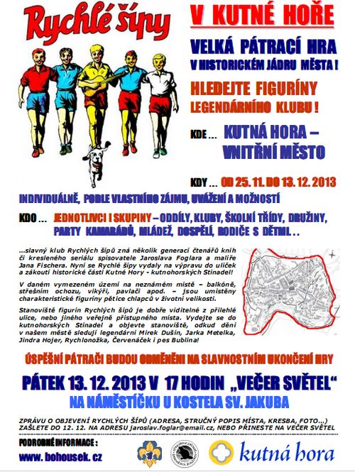 …slavný klub Rychlých šípů zná několik generací čtenářů knih či kresleného seriálu spisovatele Jaroslava Foglara a malíře Jana Fischera. Nyní se Rychlé šípy vydaly na výpravu do uliček a zákoutí historické části Kutné Hory - kutnohorských Stínadel! V daném vymezeném území na neznámém místě – balkóně, střešním ochozu, vikýři, pavlači apod. – jsou umístěny charakteristické figuríny pětice chlapců v životní velikosti. Stanoviště figurín Rychlých šípů je dobře viditelné z přilehlé ulice, nebo jiného veřejně přístupného místa. Vydejte se do kutnohorských Stínadel a objevte stanoviště, odkud dění v našem městě sledují legendární Mirek Dušín, Jarka Metelka, Jindra Hojer, Rychlonožka, Červenáček i pes Bublina!