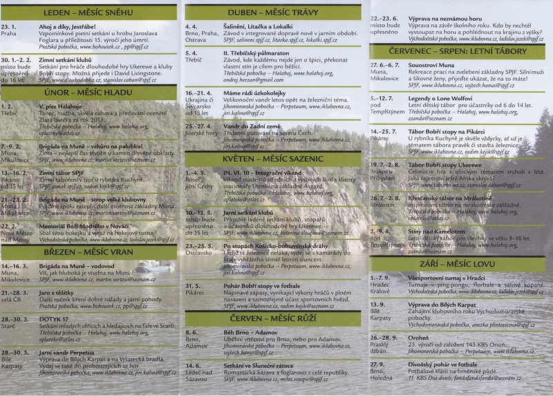 Sdružení přátel Jaroslava Foglara (SPJF) vydalo na konci loňského roku vedle dvojčísla 4-5 Bobří stopy také Seznam akcí leden - prosinec 2014. Obsahuje přehled hlavních akcí celostátního charakteru i setkání a her poboček, klubů a oddílů SPJF. Tak např. v lednu se uskuteční vzpomínkové pietní setkání u hrobu Jaroslava Foglara u příležitosti 15. výročí jeho úmrtí (23.1.) nebo Zimní setkání klubů SPJF (30. 1. - 1. 2.). V únoru se bude konat v Třebíči pátý ples Halahoje (Třebíčské pobočky SPJF), dvě brigády na MUNĚ (základně SPJF v Mikulovicích ve Slezsku), Zimní tábor SPJF u rybníka Kuchyně. Březen bude patřit nejen tradičnímu Jaru s těšítky, ale také setkání mladých věřících pod patronací Třebíčské pobočky SPJF ve Starči. Jihomoravská pobočka SPJF zase chystá jarní vandr do Bílých Karpat. V dubnu přijde čas Šalinění a vandru Jihomoravské pobočky za úzkokolejkami. V květnu se bude konat např. setkání klubů dlouhodobé hry Ukerewe a Pohár Bobří stopy ve fotbale. 8. 6. dojde na tradiční stíhací běh Brno - Adamov a 14. 6. na setkání pamětníků ve Sluneční zátoce. Východočeská pobočka SPJF zase připravuje Výpravu za neznámou horou.
