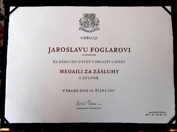 Medaile Za zásluhy I. stupně za zásluhy o stát v oblasti umění Jaroslavu Foglarovi in memoriam