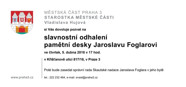 Slavnostní odhalení pamětní desky Jaroslavu Foglarovi na domě v Křišťanově 18 v Praze 3 ve čtvrtek 5. dubna 2018 v 17 hodin[ Autor: Bohoušek | zařazeno: 26. 3. 2018 | přečteno 12733 ]