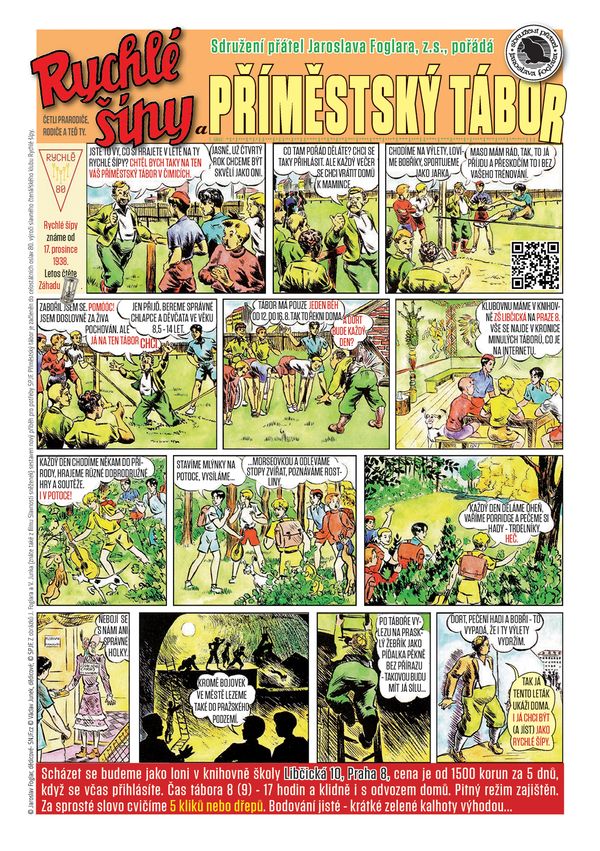 Sdružení přátel Jaroslava Foglara pořádá i letos Příměstský tábor s Rychlými šípy v Praze[ Autor: Pražská pobočka SPJF | zařazeno: 26. 3. 2019 | přečteno 11273 ]Příměstský tábor s Rychlými šípy se bude letos konat od 12. 8. do 16. 8. vždy od 8 či 9 hodin do 17 hodin. Scházet se děti budou opět v knihovně Základní školy, Libčická 10, Praha 8. Od roku 2016 proběhly v Praze 8 každoročně dva příměstské tábory s Rychlými šípy. Tábory se konaly vždy v srpnu v okolí základny ve škole v Čimicích. Za různé soutěže získávaly děti foglarovské lístečky, zkusily Modrý život a lov bobříků. Každý den ráno po zahřívací šifře vyrazily někam ven - do Prokopáku, do Čimického a Drahaňského údolí, Ďáblického háje do Šárky či na Petřín. Jeden den proběhl i v uličkách staroměstských Stínadel. Na každém potoce děti stavěly mlýnky, prolézaly podzemní chodby, závodily na strágulích, odlévaly stopy zvířat, pouštěly lodičky, vařily na ohni i pekly trdelníky. Stejně jako hrdinové “foglarovek” hrály boj o lístečky, cvičily mors eovku a v podzemní chodbě lovily bobříka odvahy. Pražský převozník Bergman je převezl ze Stínadel do Čertovky na sraz flašinetářů, kde si všechny děti vyzkoušely hraní na flašinet. Hry ve skalách na Petříně, běhání po hradbách a velká bitva s míčky u Hladové zdi vystřídalo skákání přes lano, chození po stromech, prolézání podzemí a brodění potokem. Jindy to bylo střílení lukem či pouštění vlaštovek, bobřík zdravovědy, míčové hry, stopovačky, kimovky, kešky a nácvik divadla či hra Na pašeráky a Letadlo v mlze. Dva týdny rychle utekly - byl to pestrý kus prázdnin. Děti ochutnaly příběhy hrdinů foglarovek a vyzkoušely si, co by je mohlo čekat v klubu nebo oddíle během školního roku. Rodiče i děti si tyto “obyčejné” prázdniny chválili a chtějí „příměšťák“ zopakovat také v roce 2019. Pokud si chcete přečíst kroniku těchto táborů nebo zjistit podrobnější informace, můžete tak udělat na www.spjf.cz/tabor-RS-2019 či na stránkách i www.iklubovna.cz. Nasměrování dětí do nějakých dětských organizací je hlavním smyslem těchto táborů.