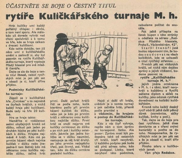 Skautská nadace Jaroslava Foglara vyhlašuje na jaro 2021 kuličkářský turnaj pro čtyři hráče (ideálně rodinný). Vítězové těchto čestných zápasů získají titul rytíře, diplom a vylosovaní výherci i věcné ceny.V roce 1939 vypsal časopis Mladý hlasatel s Jaroslavem Foglarem turnaj v kuličkářské hře Cvrnkaná a právě na něj náš letošní turnaj přímo navazuje. Jaká jsou pravidla: - hraje se ve čtyřech hráčích, každý začíná s pěti malými kuličkami - kdykoli mezi 21. 3. a 30. 5. 2021 - naměřte si vzdálenost sedmi kroků, odtud pak jeden po druhém házejte pět kuliček k důlku - kdo má po prvním házení všech kuliček nejvíce kuliček v důlku, začíná hrát první - nepadne-li tam žádná, začíná ten, kdo má kuličku nejblíže důlku - další pořadí hráčů se řídí podle toho, kolik kuliček kterému hráči padlo při prvním házení kuliček do důlku nebo jak je kdo po prvním hráči s některou svou kuličkou nejblíže důlku - první hráč se snaží některé své kuličky cvrnknout do důlku a po nich pak i kuličky ostatních - jakmile se jen jedna kulička v důlku neumístí, nastupuje za něj hráč druhý, po jeho prvním neúspěchu třetí, čtvrtý atd. - vítězí ten, kdo do důlku cvrnkne poslední kuličku A právě vítězné jméno zapište na papír a jako potvrzení ho doplňte podpisy ostatních třech hráčů. Papír následně vyfoťte a pošlete na adresu: info@skautskanadace.cz. Všichni výherci obdrží elektronicky rytířský diplom a 5 vylosovaných i věcné ceny. Hrát můžete s jakýmikoli kuličkami, pokud by se vám hodila ta pravá hlasatelská sada se skleněnkami, můžete si ji pořídit v našem Jestřábově dobročinném obchodě: www.skautskanadace.cz/kupte-si