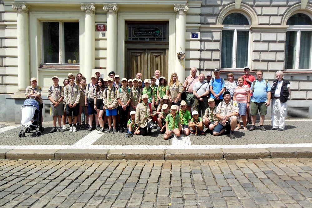 Rodný dům Jaroslava Foglara - středa, 6. července 2022, 13 hodin, 13 minut[ Autor: Martin Rosol | zařazeno: 24. 7. 2022 | přečteno 8470 ] Rekordně vysoká účast provázela letošní setkání foglarovců u rodného domu Jaroslava Foglara při příležitosti 115. výročí spisovatelova narození! Setkání kromě celé řady známých i neznámých foglarovců navštívil oddíl skautů a skautek ze 7. sboru Slánských vlků z Prešova, který táboří v Roztokách u Prahy, a při svých výpravách do metropole se věnuje především poznávání odkazu Jaroslava Foglara. Skauti ze Slovenska se účastní poznávací hry Rychlé šípy v Africe, navštívili též výstavu Město jako přízrak. Také jejich táborová hra je tématicky zaměřena na Rychlé šípy, a vlajka Rychlých šípů se stala hlavním symbolem jejich táborového odznaku. A když se k setkání se zájmem připojilo i několik náhodných kolemjdoucích a nájemníků z domu v Benátské ulici č. 3, mohli jsme napočítat rovnou půlstovku účastníků!
