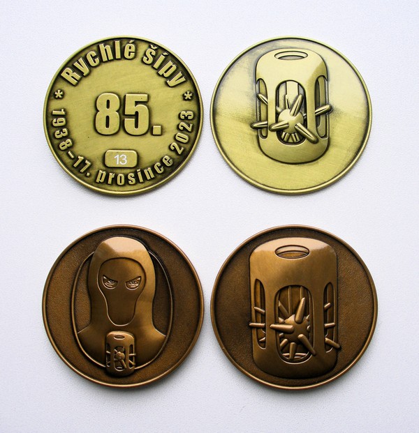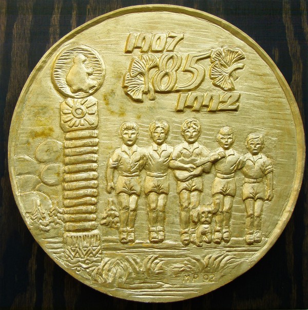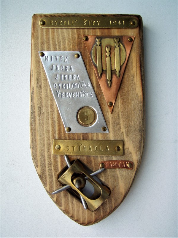 Původní výtvarný návrh rubové strany bohužel nemohl být pro technické obtíže realizován, ale mně se od samotného autora podařilo získat do sbírky velikou sádrovou plaketu o průměru 26cm s tímto původně zamýšleným motivem. Jsem velice rád, že vlastním takovou trvalou památku na tohoto vzácného člověka. (obr. 3) Po uplynutí pěti let vyšla další pamětní medaile, tentokrát u příležitosti Jestřábových devadesátin. Také ona byla ve trojím provedení barvy kovu. (obr. 4) Rád bych se ovšem zmínil o jisté kuriozitě, se kterou jsem se setkal: ![]() Podařilo se mi totiž objevit medaili, která má na aversu reliéf k Jestřábovým devadesátinám, na reversu ale nápis k jeho pětaosmdesátinám! Představuje tak kombinaci obou výše popsaných medailí! Jak tato anomálie mohla vzniknout, mi ovšem není známo. (obr. 5a, 5b) Některé další kovové medaile s foglarovskými motivy lze běžně objednat v internetových obchodech – nabízí se velké medaile s potiskem ježka v kleci o průměru 7cm (obr. 6) , případně menší – čtyřcentimetrové s vytištěným ježkem a deníkem Jana Tleskače. (obr. 7) Vše samozřejmě v provedení zlato, stříbro, bronz. Někoho možná překvapí, že existují i medaile ze dřeva! Jde o kompletní sadu 13. medailí určených pro děti s vypalovanými bobříky. (obr. 8) ![]() ![]() Za velice zajímavé považuji plakety obsahující atributy z příběhů Rychlých šípů. Jde o soukromě vyrobené předměty ze dřeva a různobarevných kovů s vlaječkami Rychlých šípů a s nápisy vážícími se k jejich příběhům a dokonce i s vloženými miniaturními ježky v klecích! Nejstarší z trojice těchto plaket, které vlastním, je údajně z roku 1939, další dvě nesou vyražený letopočet 1941. O jejich původu mi prodejce prozradil jenom tolik, že jde o pozůstalost po starém pánovi, který už nežije. Skutečné stáří těchto pozoruhodných výrobků tedy nelze nikterak ověřit, naopak je možné o něm dokonce pochybovat. (obr. 9 - 11) Zvláštností je též plaketa vyřezávaná laserovou technologií ze silného nerezového ocelového plechu ve tvaru ježka v kleci, kterou nechal v několika exemplářích zhotovit foglarovec a sběratel Patrik Havel z Ledče nad Sázavou. (obr. 13) Barevně sbírku oživují také reklamní plakety od známého výrobce hlavolamů Radka Micopulose. (obr. 14) Velmi kvalitní provedení má drobná medailka (mince) vydaná v roce 2021 Skautskou nadací Jaroslava Foglara. Na líci nese nápis a logo Mladý hlasatel a na rubu nápis Rychlé šípy. (obr. 15) K nejnovějším medailovým přírůstkům patří pamětní mince vydaná Spolkem Pražská Dvojka – Hoši od Bobří řeky. Výtěžek z prodeje bude použit k financování reprintů historických dvojkařských oddílových kronik. (obr. 16) A úplně poslední medailovou novinkou jsou limitované třicetikusové edice dvou kovových plaket od kbelských skautů S.S.V. k 85. výročí Rychlých šípů. (obr. 17) (Zpracováno pro zpravodaj Klubu skautských sběratelů Junáka – ZIPSS 3/2021; aktualizováno pro Bohouška v prosinci 2023) |