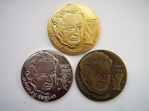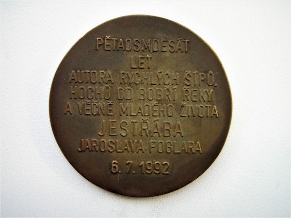 Foglarovské odznaky 5/8 – medaile, plakety a mince[ Autor: Martin Rosol | zařazeno: 6. 1. 2024 | přečteno 8263 ] K dalším druhům foglarovských odznaků, které si bezpochyby zasluhují pozornost sběratelovu patří medaile a plakety. Patrně nejstarší pamětní medaile, která se váže k Jestřábovu jubileu pochází z roku 1987 a připravili ji ve dvojím provedení kovu (stříbro a měď) k jeho osmdesátinám foglarovci z Tanvaldu. (obr. 1) Další z medailí vydaných nejprve k Jestřábovým pětaosmdesátinám a později devadesátinám už nesou podpis nezapomenutelného výtvarníka a foglarovce Vladimíra Pechara – Pluta. Medaile z roku 1992 v provedení zlato, stříbro a bronz představuje na líci čelní portrét Jaroslava Foglara, na rubu pak oslavný text k jeho pětaosmdesátinám (v některých případech zůstala rubová strana hladká). (obr. 2)