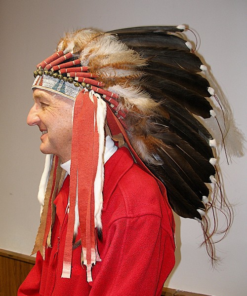 Indiánská čelenka na AJF Veliké (před)vánoční překvapení si nakonec pro nás přichystal Luděk Nykles – Viki, když z koženého pouzdra obřadně vyjmul doopravdickou, skutečně pravou indiánskou čelenku s pery, kterou jsme si mohli všichni postupně nasadit a v ní se vyfotografovat. Podobná příležitost se hned tak nikomu nenaskytne a my za ni Vikimu moc děkujeme! Obr. – V indiánské čelence.