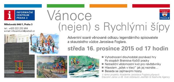 Svět Jaroslava Foglara se stal pro několik generací skutečností, romantikou, která nahrazovala šeď všednosti. Jaký byl jeho život profesní i osobní? Přednášející PhDr. Tomáš Vučka je autorem nedávno vydané monografie Cesta za Modrým světlem. Přednáška se koná 13. 1. 2016 od 10 hodin v KC Vozovna, Za žižkovskou vozovnou 18, Praha 3 Akce je pořádánav rámci projektu Literáti z naší čtvrti. Více informací na www.literatiznasictvrti.cz tel: 602 411 101 Vstup zdarma více... Akademie Jaroslava Foglara zve na lednové akce v Praze[ Autor: Akademie Jaroslava Foglara | vydáno: 11. 1. 2016 | přečteno 13904 | přidat komentář ]Ve středu 13. ledna se v rámci projektu Akademie Jaroslava Foglara můžete zúčastnit: